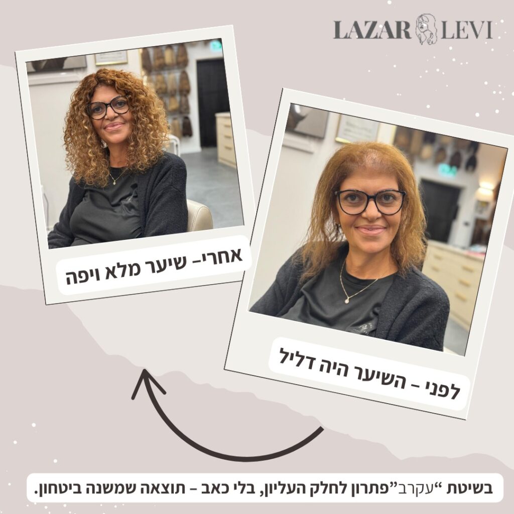 השיער הדליל בחלק העליון אינו גזרה משמים! שיטת העקרב הייחודית שלנו מספקת פתרון 100% טבעי ללא כימיקליים מזיקים או הליכים פולשניים. בניגוד לפתרונות אחרים בשוק, אנו מאמינים שהדרך הטובה ביותר לטפל בשיער דליל היא באמצעות יחידות טופ משיער אנושי אמיתי בלבד.