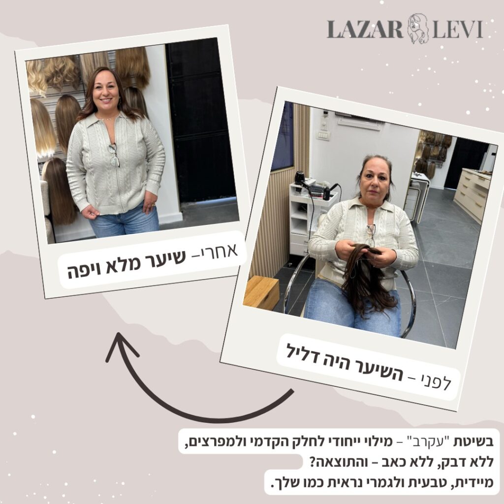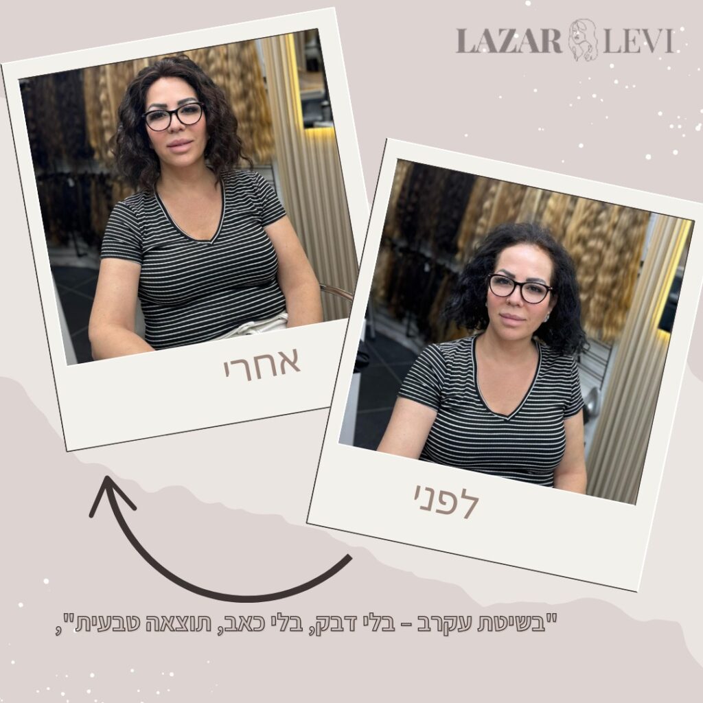 שיטת העקרב מבוססת על שימוש ב-100% שיער אנושי טבעי, ללא כימיקלים, דבקים או הליכים פולשניים. בניגוד לשיטות אחרות, היא מספקת תוצאה מיידית, מראה בלתי מובחן ונוחות יומיומית – כולל בזמן שינה, ספורט ואפילו שחייה.